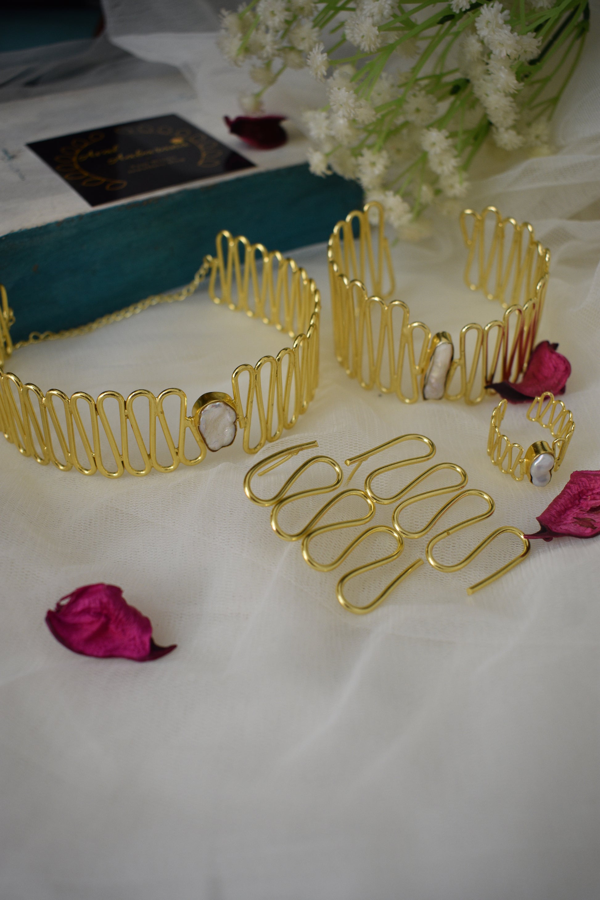 Experience luxury with our combo-Brass statement choker adorned with a stunning Baroque Pearl. Complete the look with our matching earring, hand cuff, and finger ring. Elevate your style with this versatile set, perfect for any occasion. Made with high-quality brass for a lasting statement.