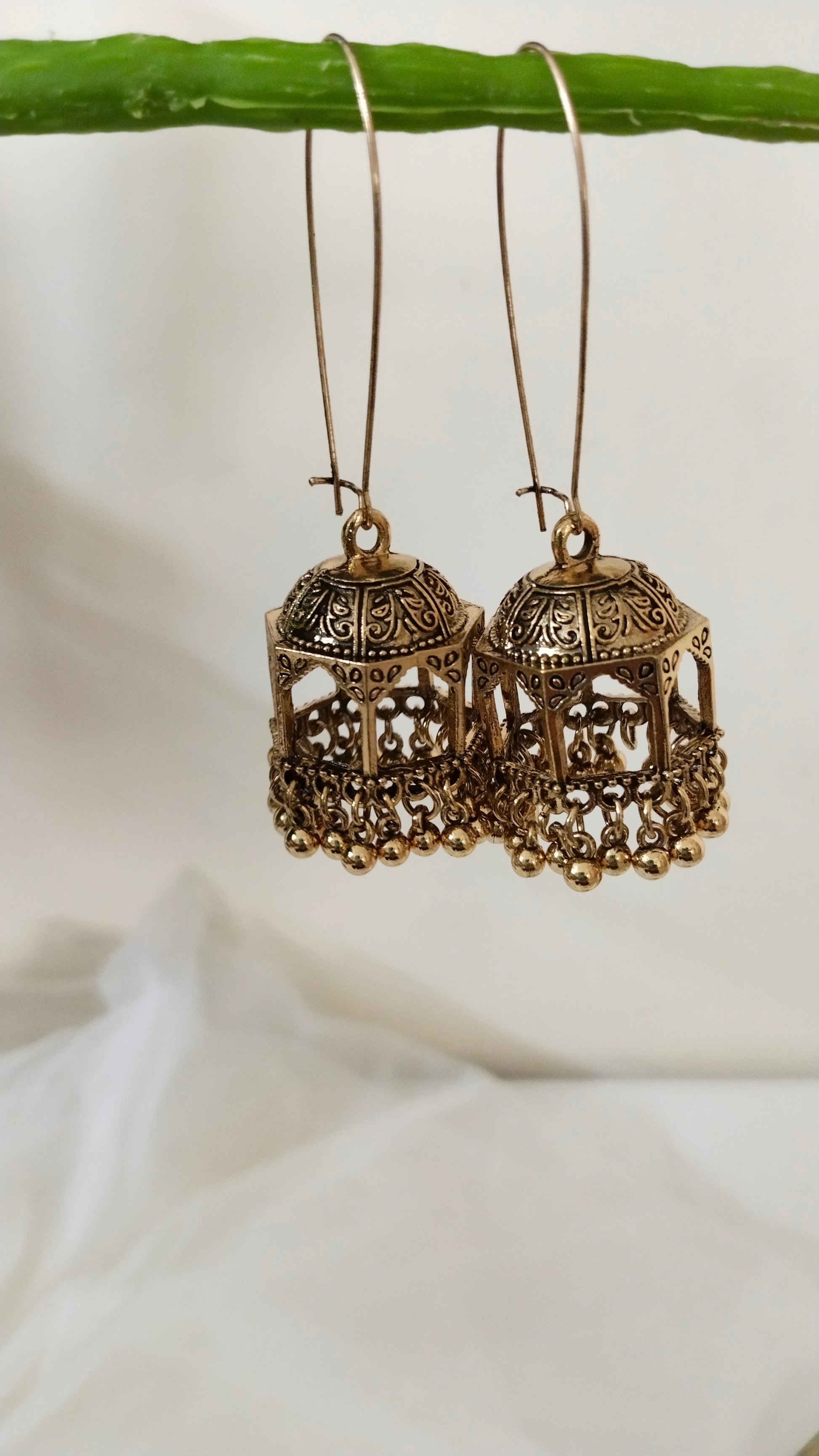 Introducing our beautifully crafted long hook Jhumka in silver and antique tones. These earrings are expertly designed to add an elegant touch to any outfit. Made with high-quality materials, they offer a unique and sophisticated look. The perfect addition to your jewelry collection.