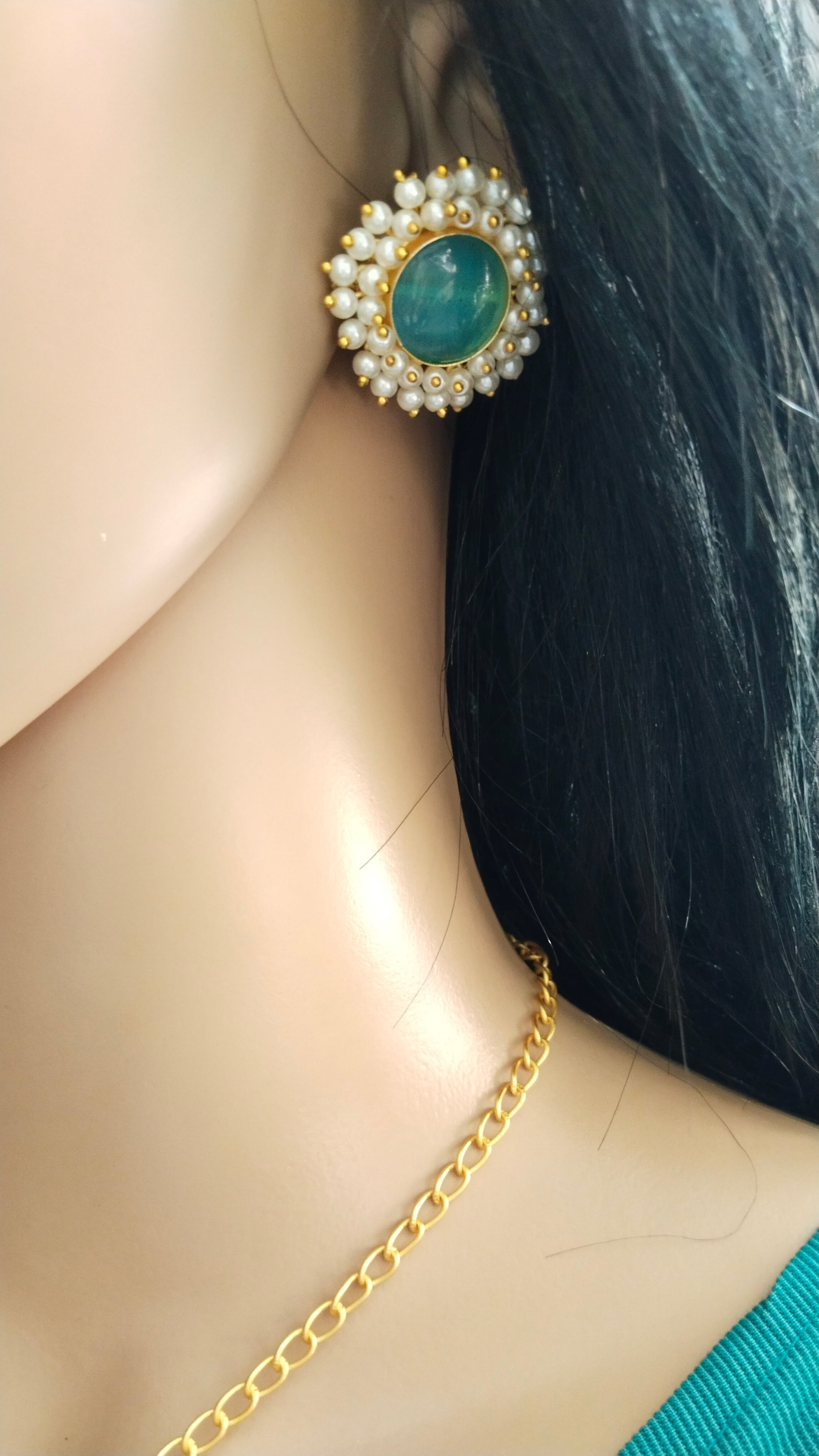 Monalisa stone, adorned with pearl pendant chain, earring, and finger ring combo offers a stunning, versatile set of accessories that elevate any outfit. Featuring a lustrous pearl and Monalisa stone, each piece is expertly crafted and adds a touch of sophistication and elegance.