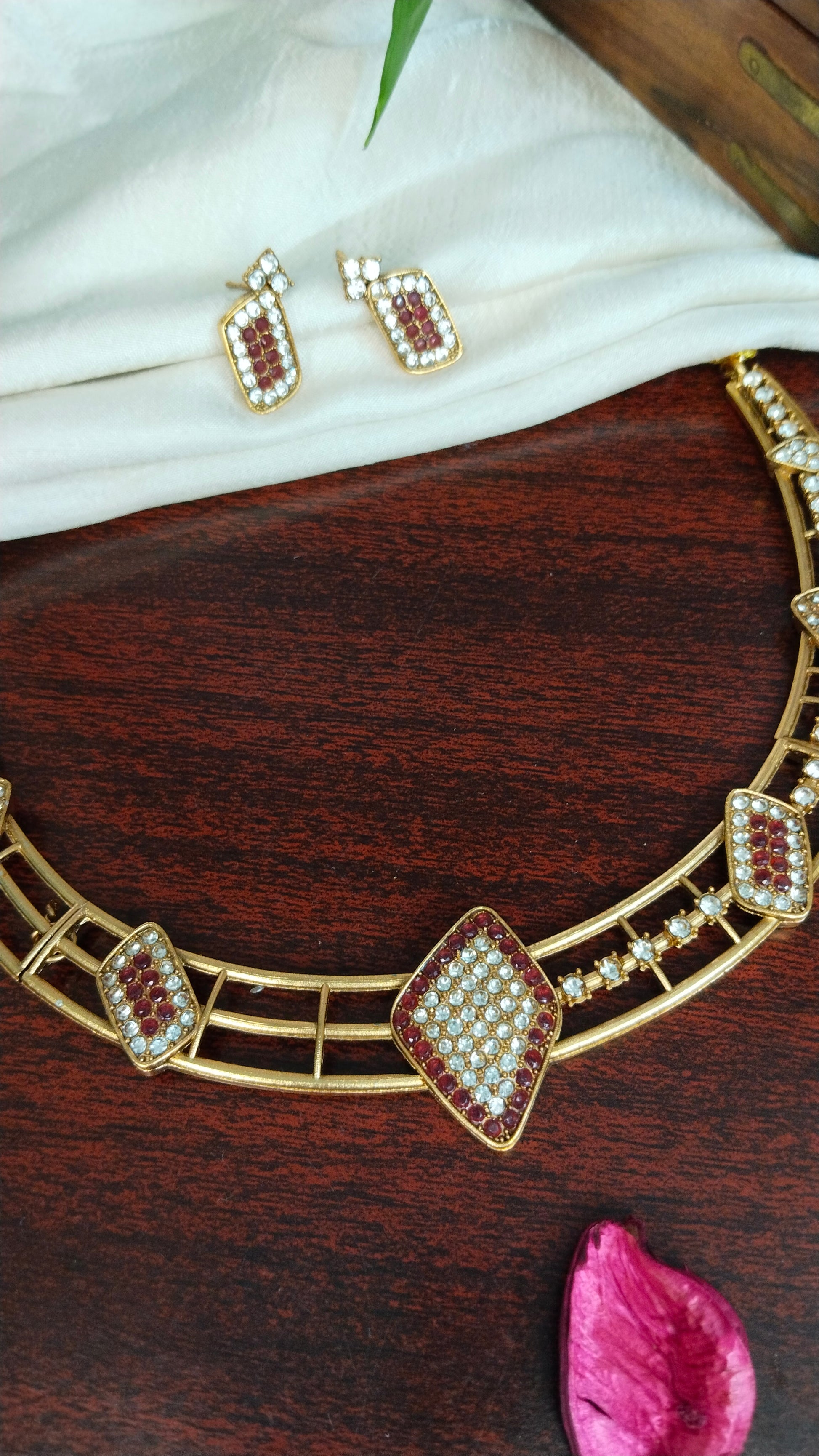This elegant hasli choker set comes with matching earrings. Crafted with intricate details, this set is perfect for completing any outfit. The choker adds a touch of glamour while the earrings add a subtle sparkle. A must-have for any jewelry collection.