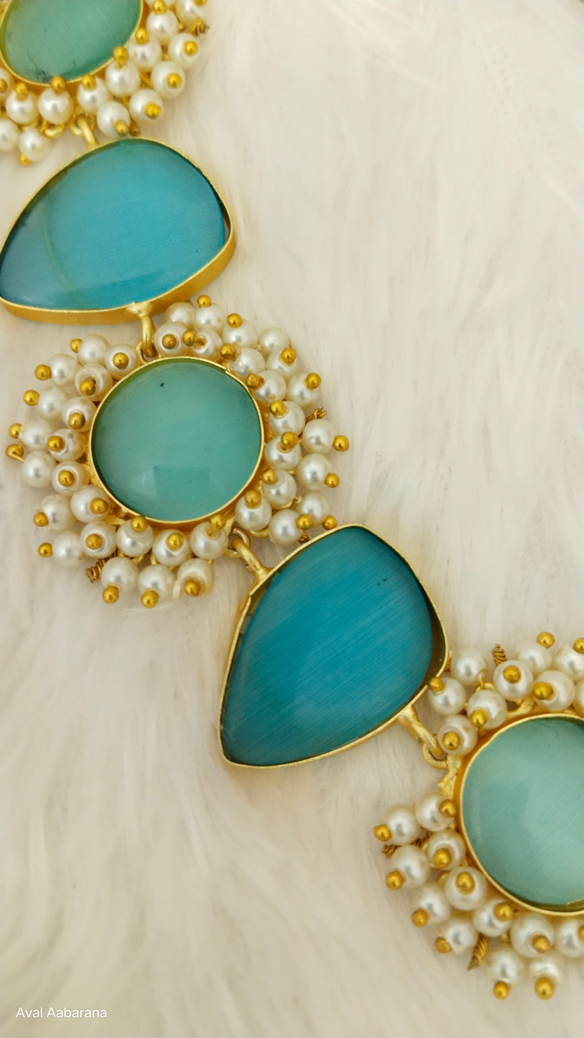 Teal blue monalisa Stone Brass necklace set adorned with pearl