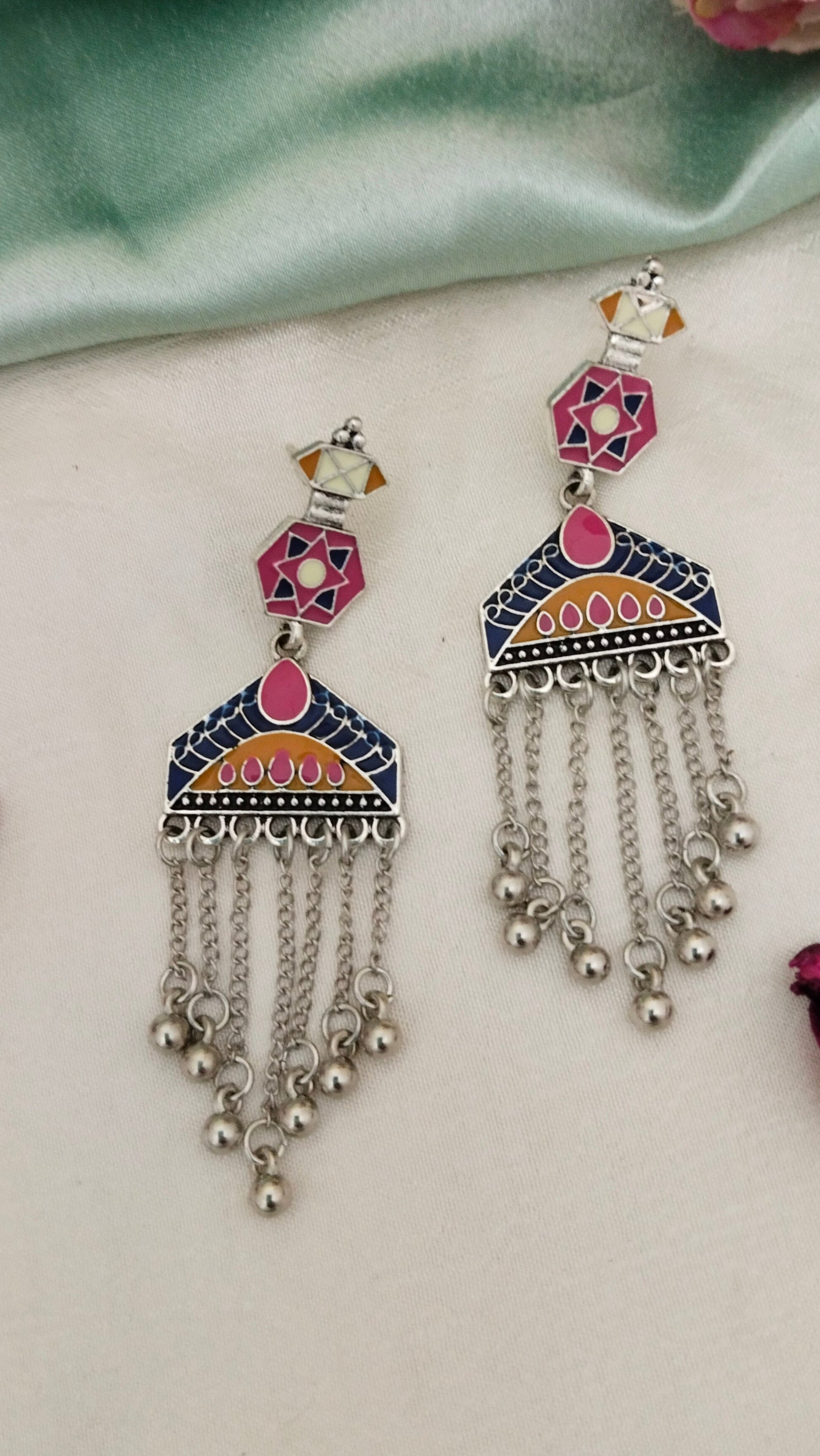 These enameled multicolor hanging earrings are a trendy addition to any outfit. The vibrant colors and unique design will make you stand out in any crowd. Expertly crafted with quality materials, these earrings are comfortable to wear and will enhance your style.